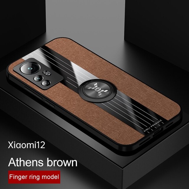 หยิบลงตะกร้า | เคส Xiaomi 12 #เคสฝาหลังเคลือบผ้าเนื้อมีแหวนสวมนิ้ว TPU ไฮบริด+อะคริลิ + แหวนโลหะ [ในตัวแผ่นโลหะแม่เหล็ก] Fashion Woven Cloth Casing Finger Ring Holder Back Case สีน้ำตาล