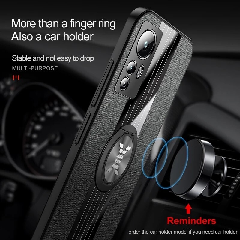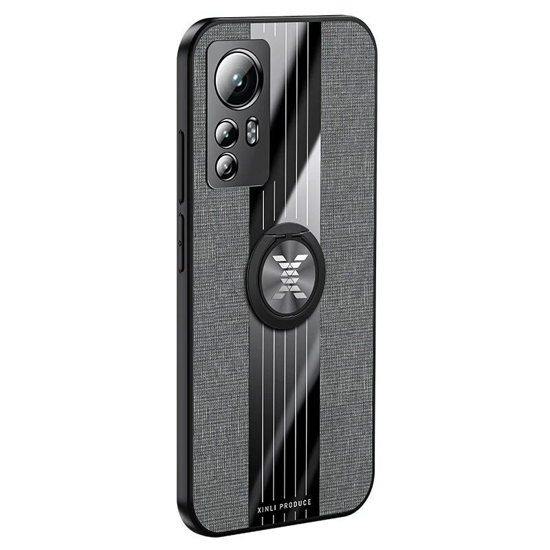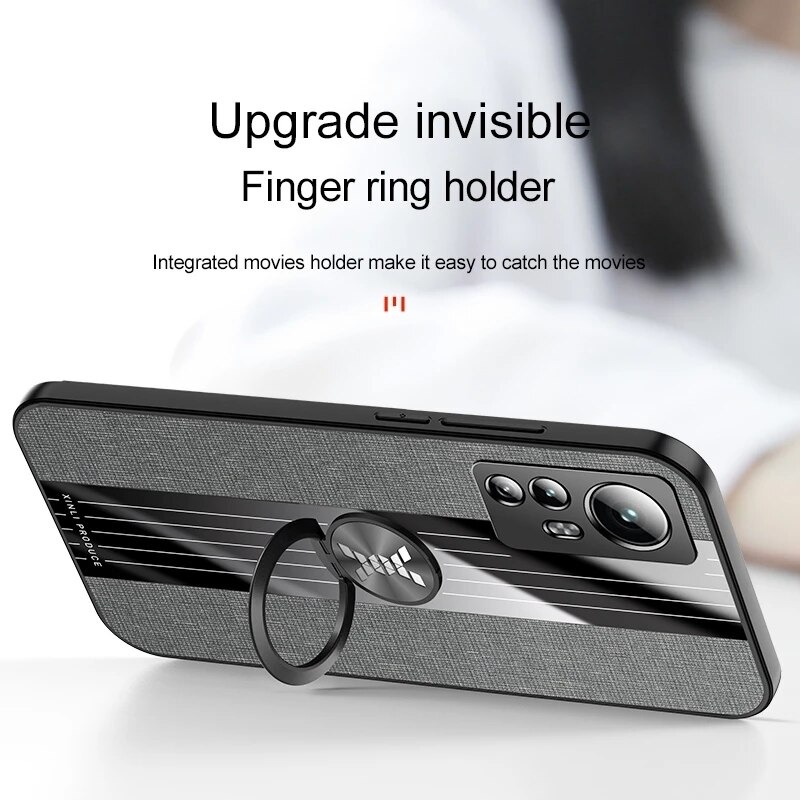 หยิบลงตะกร้า | เคส Xiaomi 12 #เคสฝาหลังเคลือบผ้าเนื้อมีแหวนสวมนิ้ว TPU ไฮบริด+อะคริลิ + แหวนโลหะ [ในตัวแผ่นโลหะแม่เหล็ก] Fashion Woven Cloth Casing Finger Ring Holder Back Case สีเทา