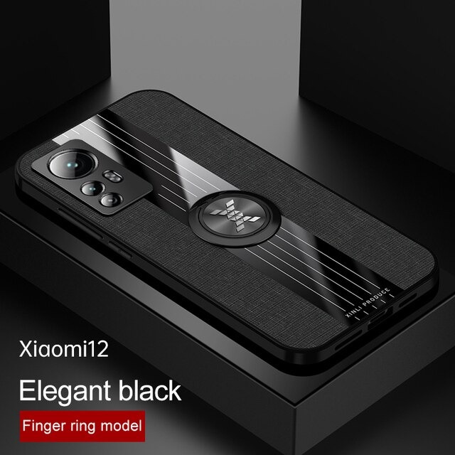 | เคส Xiaomi 12 #เคสฝาหลังเคลือบผ้าเนื้อมีแหวนสวมนิ้ว TPU ไฮบริด+อะคริลิ + แหวนโลหะ [ในตัวแผ่นโลหะแม่เหล็ก] Fashion Woven Cloth Casing Finger Ring Holder Back Case สีดำ
