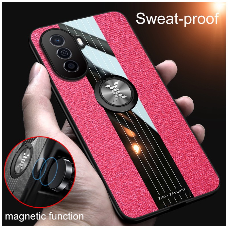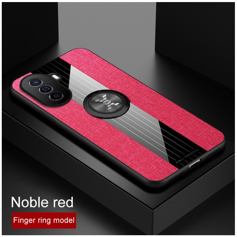 หยิบลงตะกร้า | เคส Huawei Nova Y70 #เคสฝาหลังเคลือบผ้าเนื้อมีแหวนสวมนิ้ว TPU ไฮบริด+อะคริลิ + แหวนโลหะ [ในตัวแผ่นโลหะแม่เหล็ก] Fashion Woven Cloth Casing Finger Ring Holder Back Case สีแดง