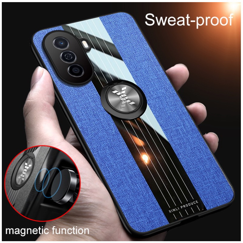 | เคส Huawei Nova Y70 #เคสฝาหลังเคลือบผ้าเนื้อมีแหวนสวมนิ้ว TPU ไฮบริด+อะคริลิ + แหวนโลหะ [ในตัวแผ่นโลหะแม่เหล็ก] Fashion Woven Cloth Casing Finger Ring Holder Back Case สีฟ้า