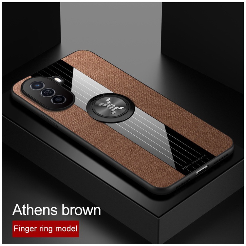หยิบลงตะกร้า | เคส Huawei Nova Y70 #เคสฝาหลังเคลือบผ้าเนื้อมีแหวนสวมนิ้ว TPU ไฮบริด+อะคริลิ + แหวนโลหะ [ในตัวแผ่นโลหะแม่เหล็ก] Fashion Woven Cloth Casing Finger Ring Holder Back Case สีน้ำตาล