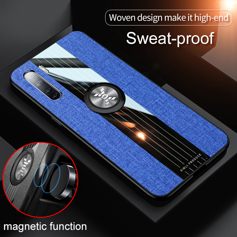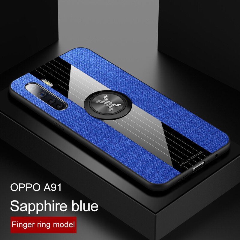 | เคส OPPO A91 #เคสฝาหลังเคลือบผ้าเนื้อมีแหวนสวมนิ้ว TPU ไฮบริด+อะคริลิ + แหวนโลหะ [ในตัวแผ่นโลหะแม่เหล็ก] สีฟ้า