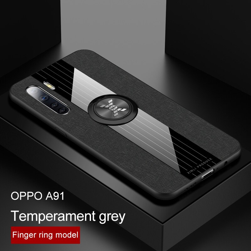 หยิบลงตะกร้า | เคส OPPO A91 #เคสฝาหลังเคลือบผ้าเนื้อมีแหวนสวมนิ้ว TPU ไฮบริด+อะคริลิ + แหวนโลหะ [ในตัวแผ่นโลหะแม่เหล็ก] สีเทา